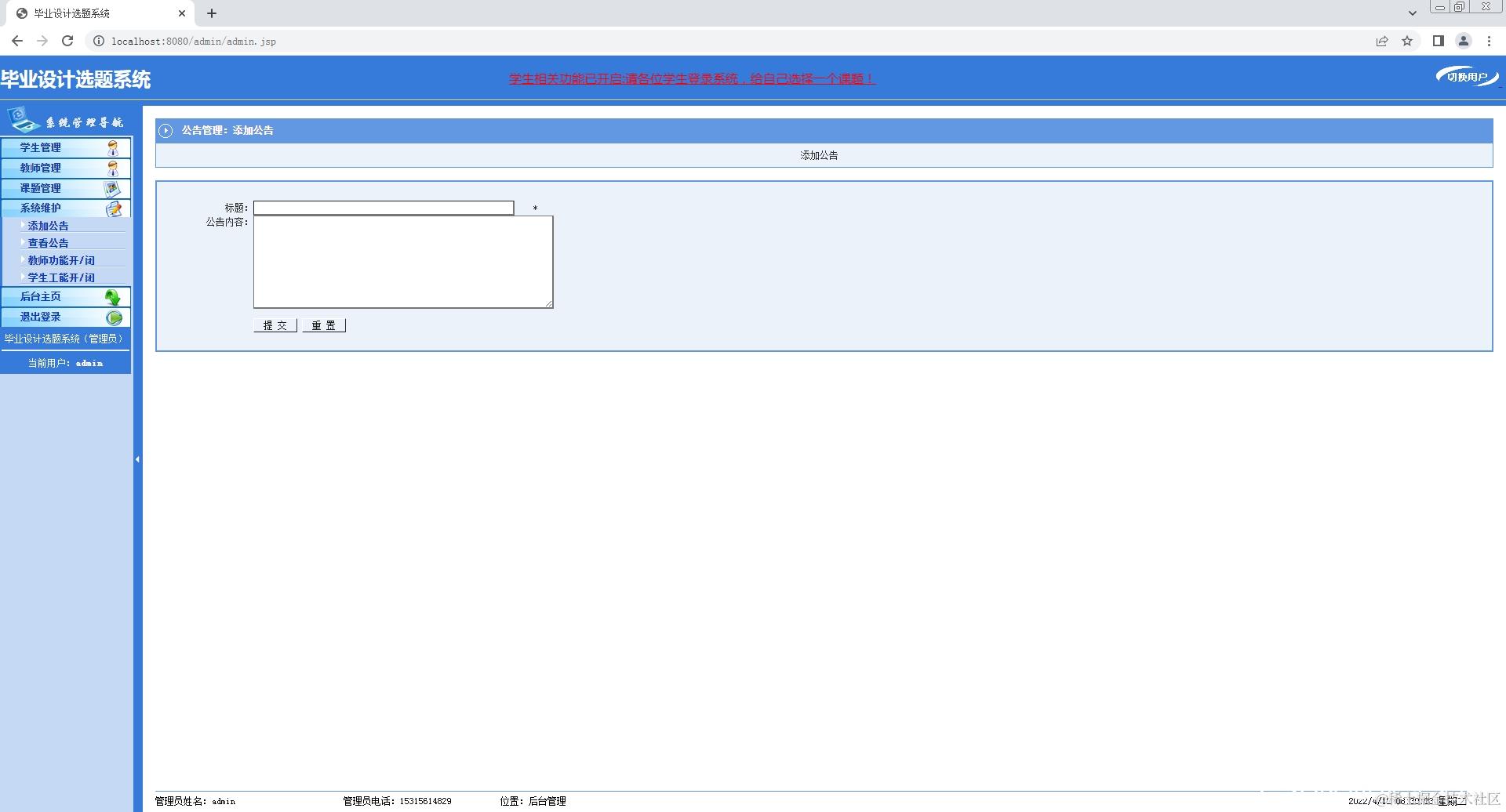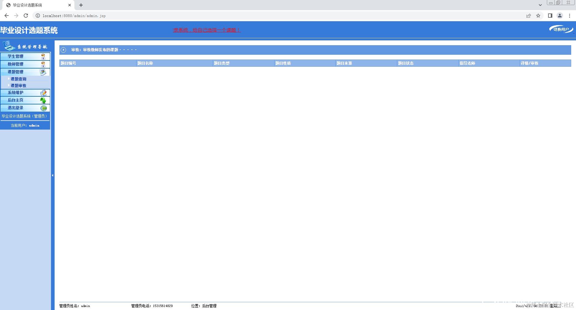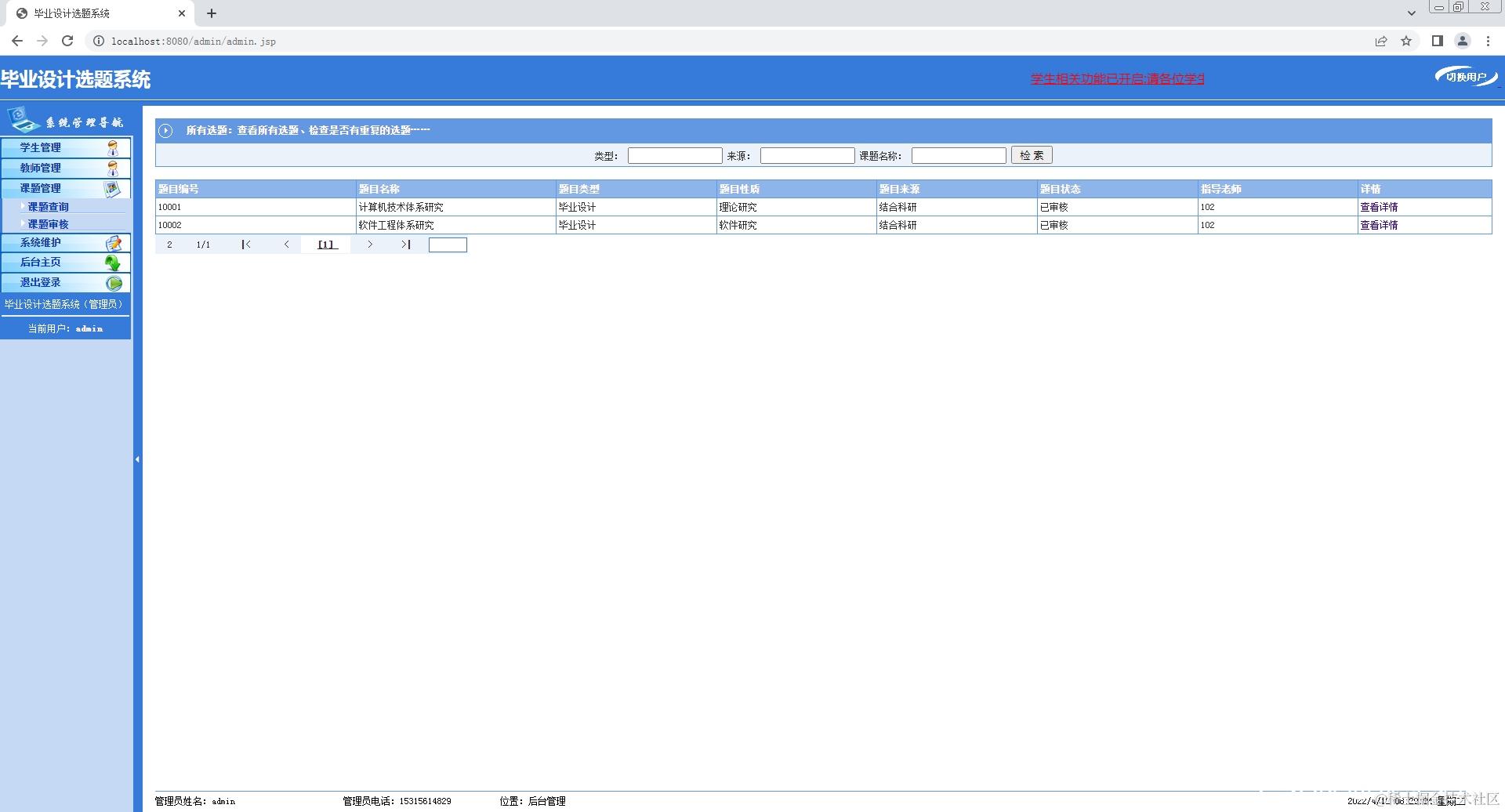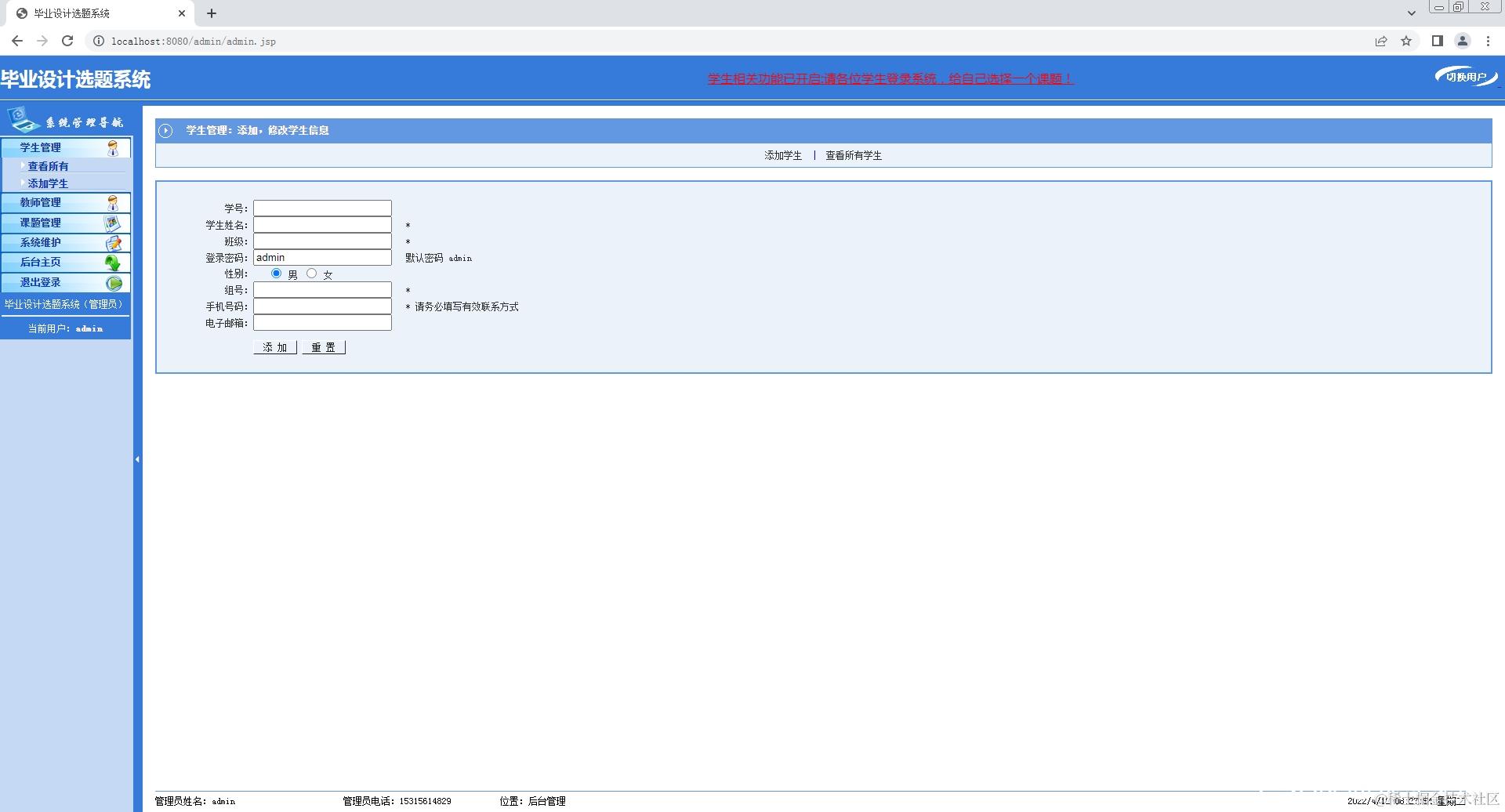 2.教师登录系统,修改个人信息,添加课题,查看课题;