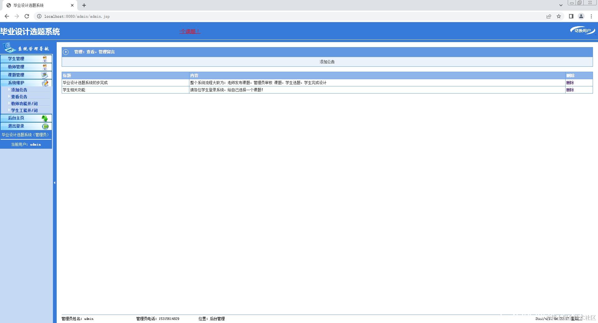 INSERT INTO `msg` VALUES ('毕业设计选题系统初步完成', '整个系统流程大致为:老师发布课题,管理员审核\r\n\r\n课题,学生选题,学生完成设计');