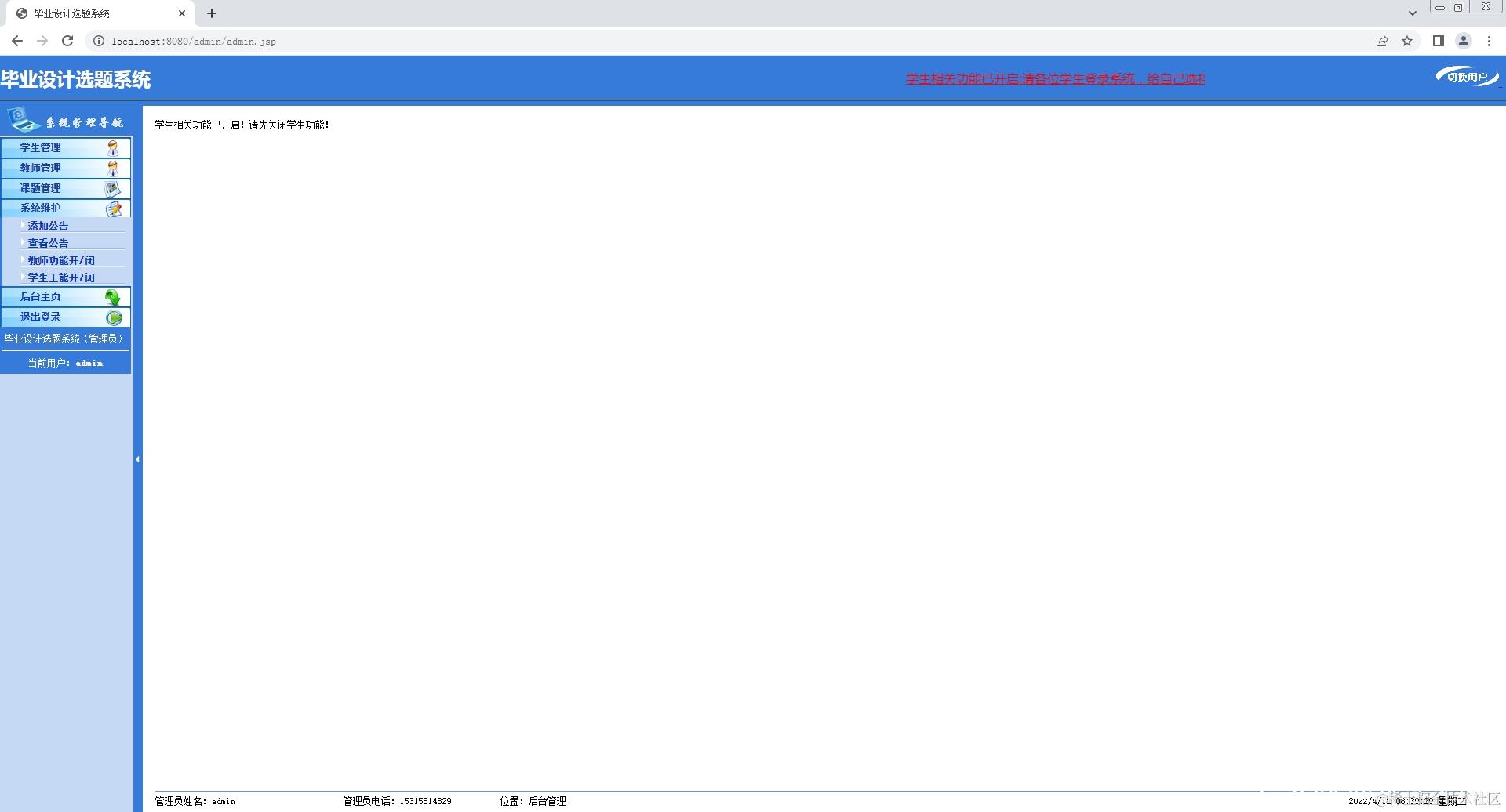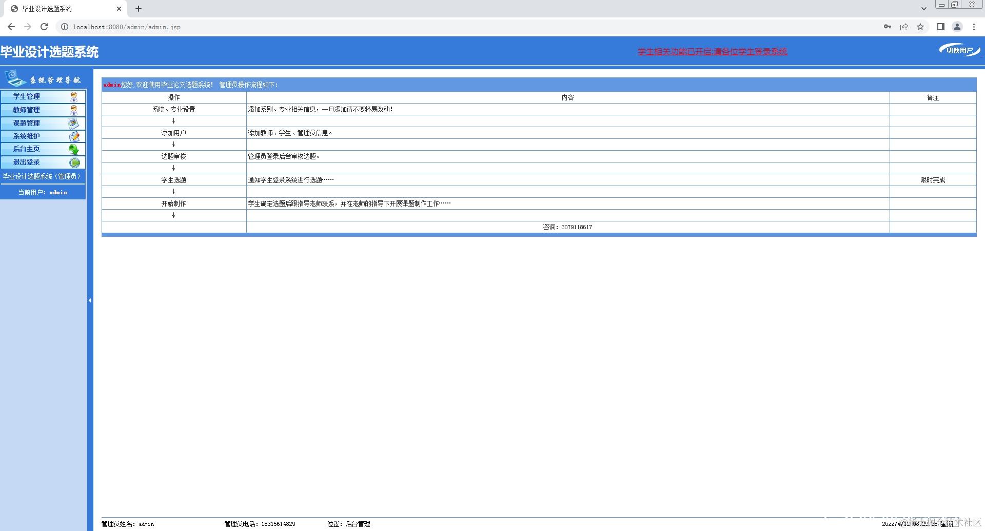 1.管理员登录系统,管理学生信息,管理教师信息,管理课题信息,系统维护功能;