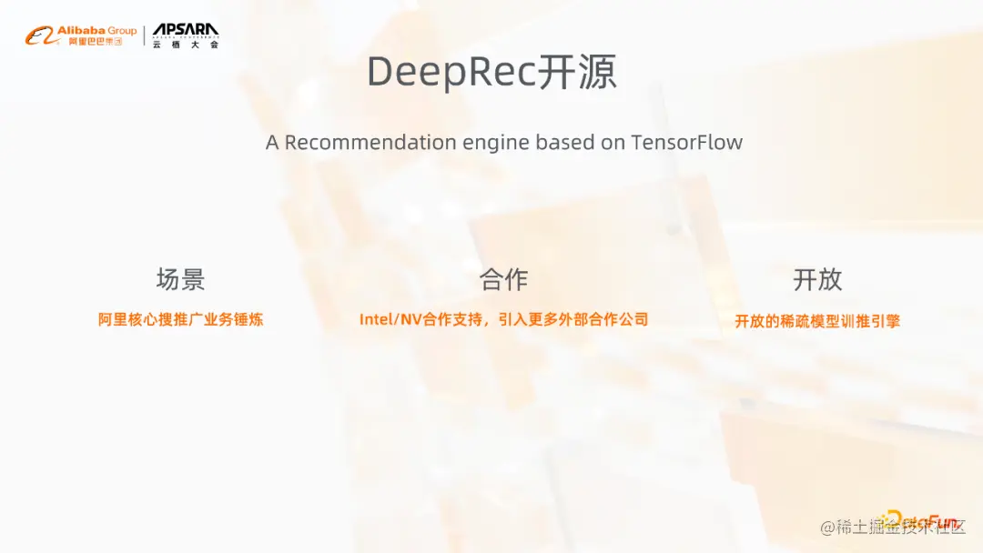 我们也希望后面在开源的过程中,能跟更多的公司去合作,去接触到更多的业务场景,把DeepRec用得更广。因为不同的业务场景对于模型的效果、模型的训练,以及他们的样本、模型差异都是非常大的。