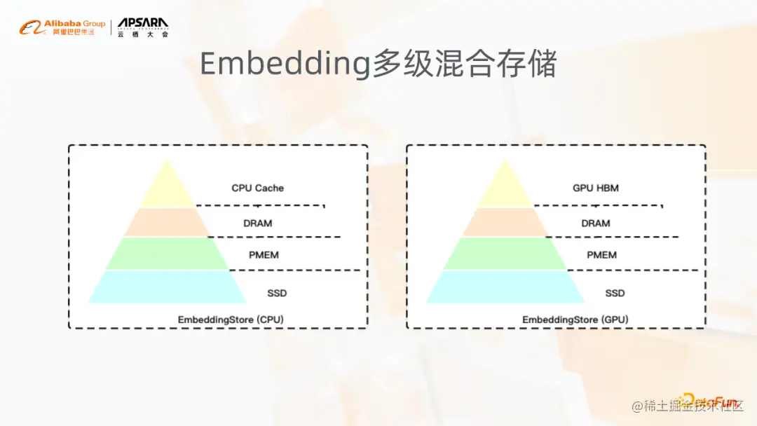 此外,在这种超大的embedding场景下,对于多级混合存储的需求是非常急迫的。因为本身embedding的这些特征,存在很明显的冷热区分。这种明显的冷热区分,可以通过多级混合存储既满足了性能的要求,同时满足了成本的需求。此外这种多级混合存储更好的一点就是它更能够大大地降低对分布式的依赖。