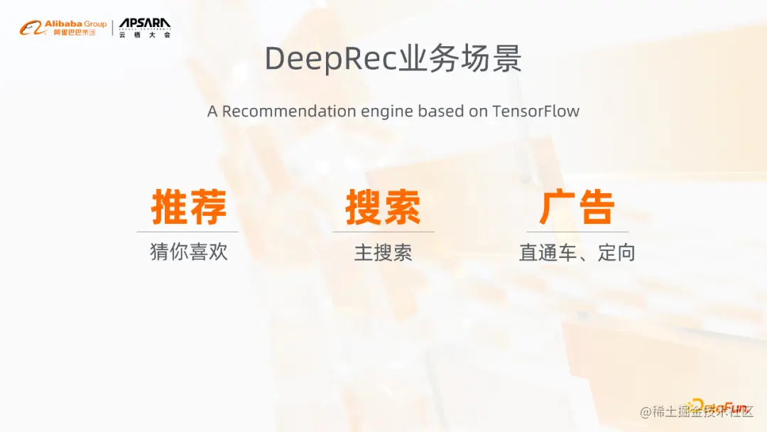 DeepRec在阿里内部使用的核心的业务场景主要就是猜你喜欢、主搜索,还有广告的直通车和定向。
