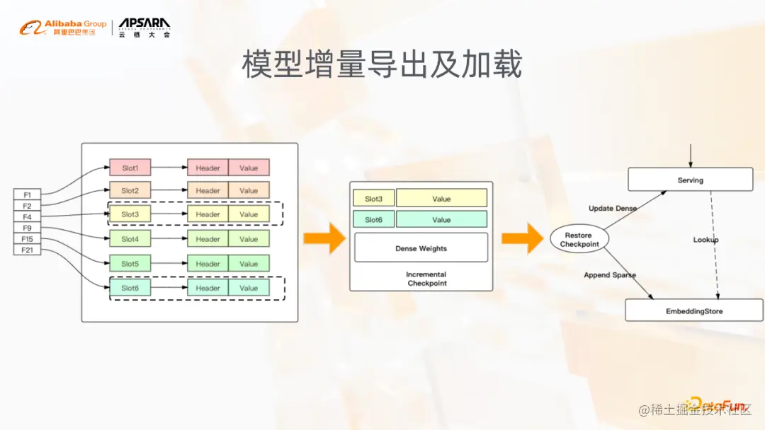 在模型的Serving和导出方面,我们支持模型的增量导出和加载,而这里是针对稀疏模型典型的一个需求,即每隔一段时间都需要去快速产生一个上线的模型,也就是像ODL。在ODL场景下,分钟级别秒级别的模型更新的时候,需要快速产生一个模型,并且这个模型首先要达到上线的需求,其次它的大小也应该是足够小的。增量模型就是记录了在一个时间段内的稀疏参数的变化情况,然后将变化的这些参数导出到模型中,这样增量的模型通常非常小。