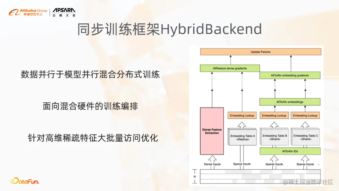 展开讲一下混合并行的这种分布式训练。不同的稀疏特征,比如说ID类型的特征,相对来讲会非常大,对于有些特征,它的特征的量非常少,比如说省份、性别这种类型的特征。不同的特征,它的同步方式是有区别的,就像大的这种稀疏的特征,使用AllToAllv的方式进行同步;对于小size的特征列和稠密参数直接使用AllReduce进行同步梯度。此外会基于GPU的硬件特点,进行训练的编排,而这里其实主要还是基于硬件,GPU底下NVLink以及RDMA本身的硬件的排布,去做同步的方案。