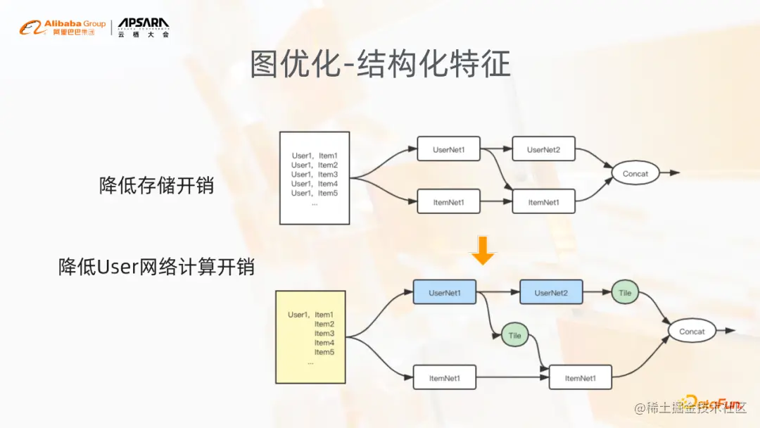 在图优化层面,当我们把输入变成了一个user对多个item以及多个label的形式之后,user侧的网络其实也会简化,因为user侧网络的输入,它的user侧的特征可能变得很少,这个时候它的计算以及它的embedding lookup都会变得更少,当需要和item侧进行结合的时候,要做tensor的展开。