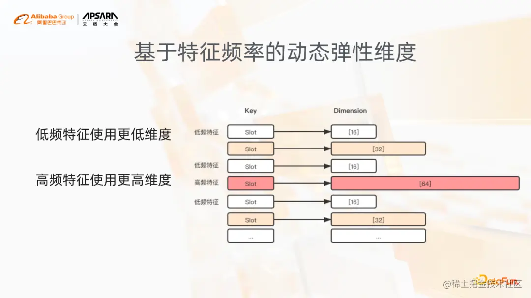 低频的特征像图中表示的就是这种用16位来表达,越高频的特征用更高的维度来表达,这样去解决低频特征,因为它更新的训练的几率、机会比较少,可能出现的这种过拟合问题,当然也是一定程度上提高高频特征本身的表达能力,这样的话,大家也都有一个common sense,就是在我们的稀疏模型里面,高频特征占比通常也是比较少的,但其实通过这个功能也一定程度上能够降低模型的size,在我们的一些场景里边模型size能够降低几倍。