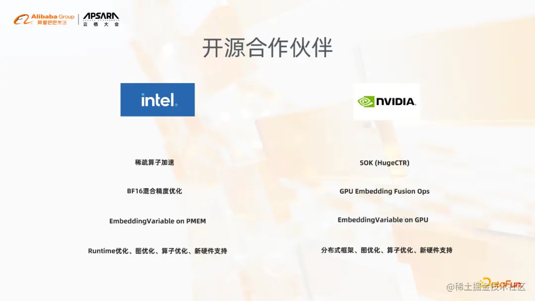 现在我们跟英特尔、英伟达已经在DeepRec内部沉淀了非常多的功能,包括像稀疏分子的加速,HugeCTR也已经在DeepRec接入了。包括像GPU的一些OP,GPU的hashtable,以及Runtime优化、图优化算子优化的一些实现,以及软硬件一体化的一些设计,另外在稀疏场景模型训练中,也正在做一些硬件的工作。
