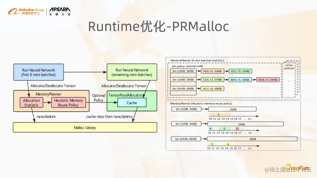 上图是挑选了Runtime优化中的PRMalloc工作,我们针对这种模型训练的一个特点,将模型的训练前面,比如训练过程前面的K轮进行一些统计,通过Malloc的这样一个模块,对内存的分配,包括分配的时间点、分配的大小,统计好分配的时间点和大小后,在K轮结束之后会使用启发式的一些算法规划出一个较优的缓存,而这个缓存会用于K轮之后的内存分配。