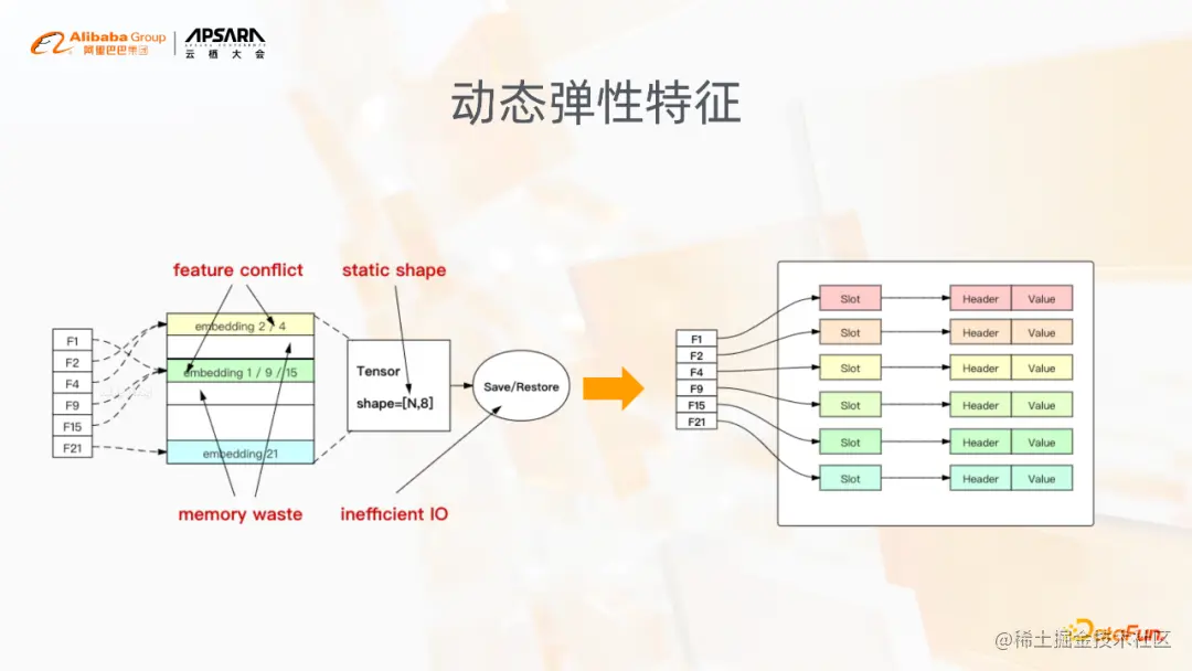动态弹性特征是稀疏模型训练里面非常基础的一个功能,解决的就是像原生的Tensorflow里面,在训练的时候,固定的参数bucket size和固定dimension带来的问题。稀疏模型训练,通常这种增量训练可能一个模型要持续训练很久,模型参数固定之后,自然而然就有上图中列出的几个问题,像特征冲突、内存浪费,以及可能因为静态shape设置得比较大造成的无效的IO等问题。