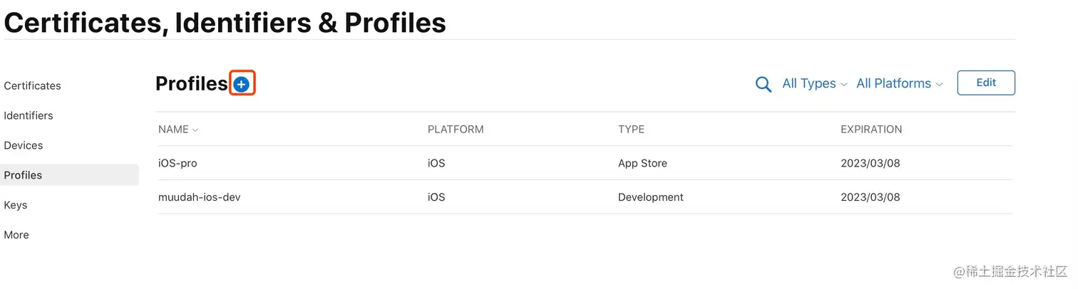 - 在证书管理页面选择 “Profiles”,可查看到已申请的所有描述文件,点击页面上的加号来添加一个新的描述文件: