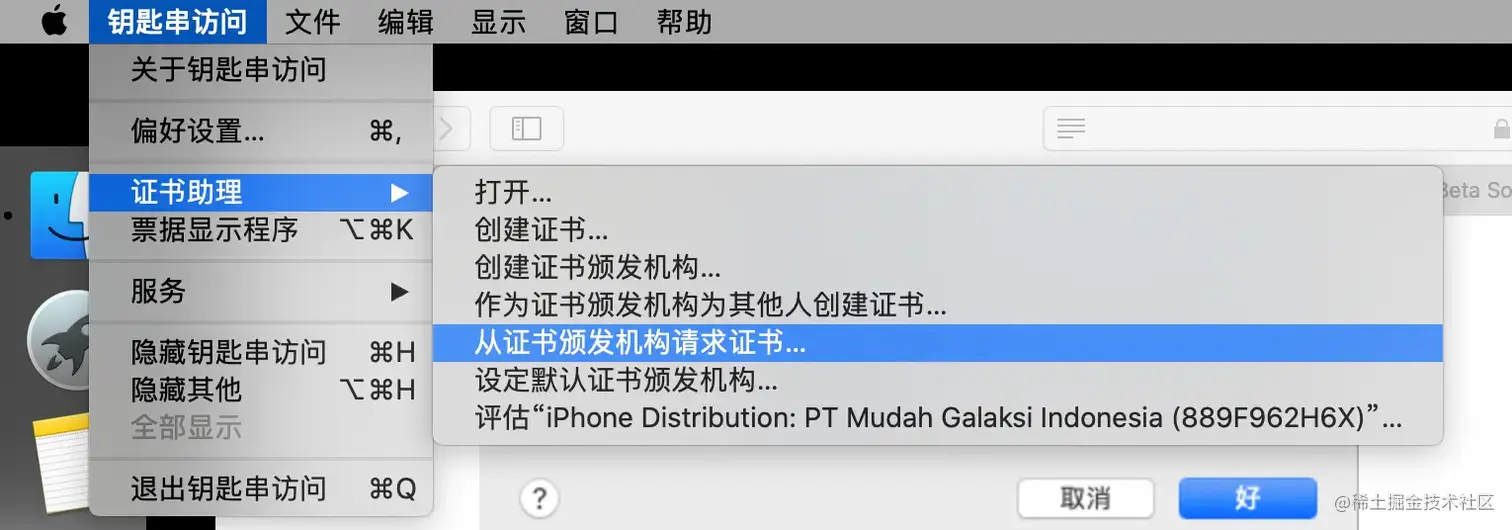 - 打开菜单 “钥匙串访问”->“证书助理”,选择“从证书颁发机构请求证书...”: