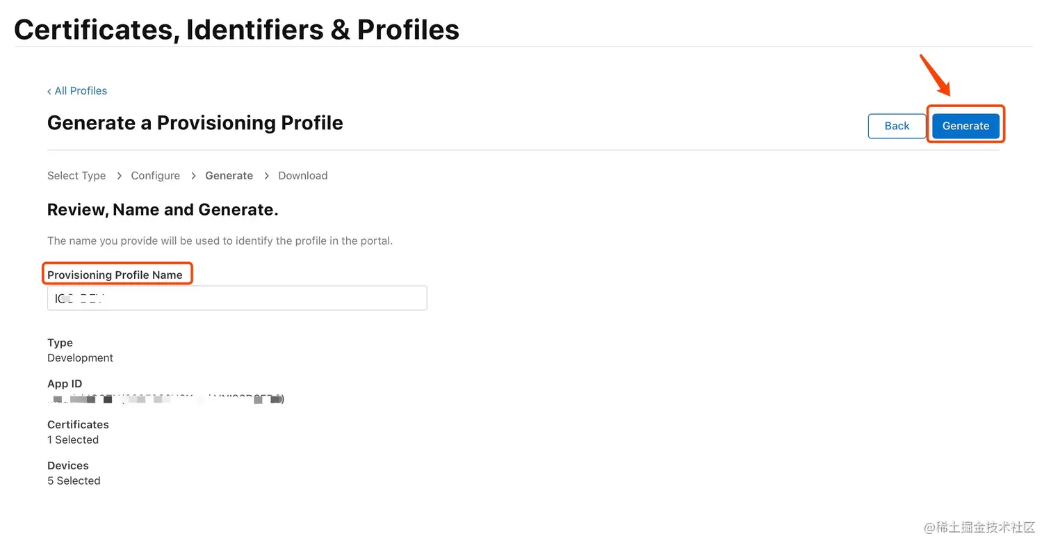 - 输入描述文件的名称(如“xxxxProfile”), 点击 “Generate” 生成描述文件: