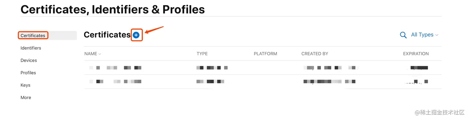- 在证书管理页面选择 “Certificates" 可查看到已申请的所有证书(TYPE:Development 为开发证书,Distribution为发布证书),点击页面的加号来创建一个新的证书: