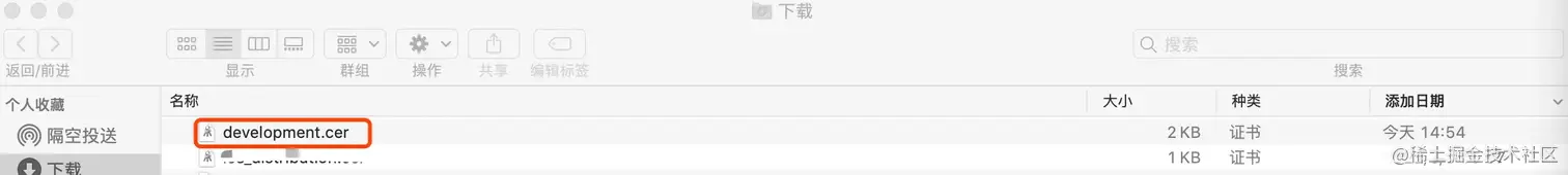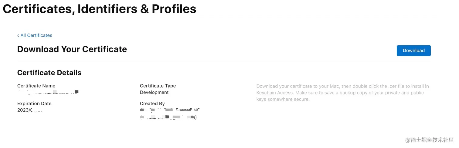 - 生成证书后选择 “Download” 将证书下到本地 (development.cer):