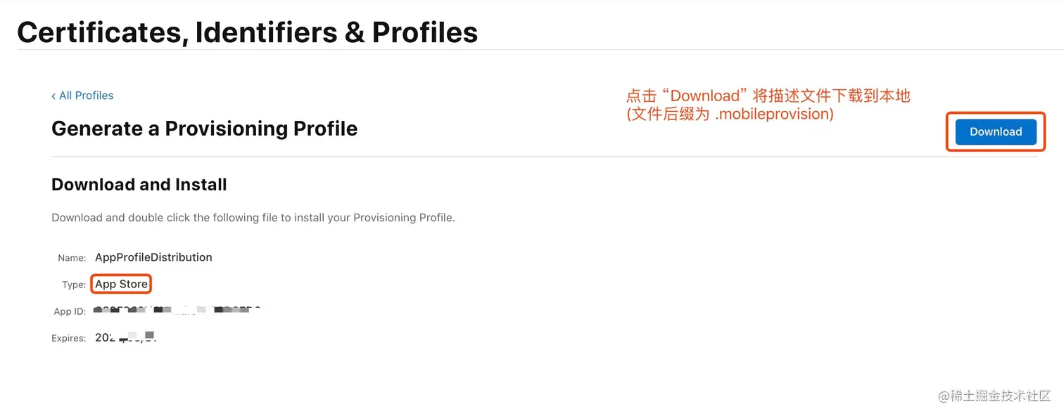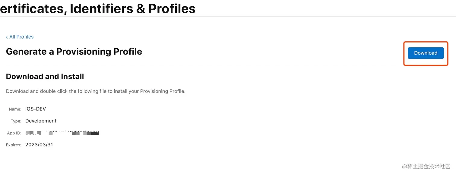- 然后点击 “Download” 将描述文件下载到本地(文件后缀为 .mobileprovision),