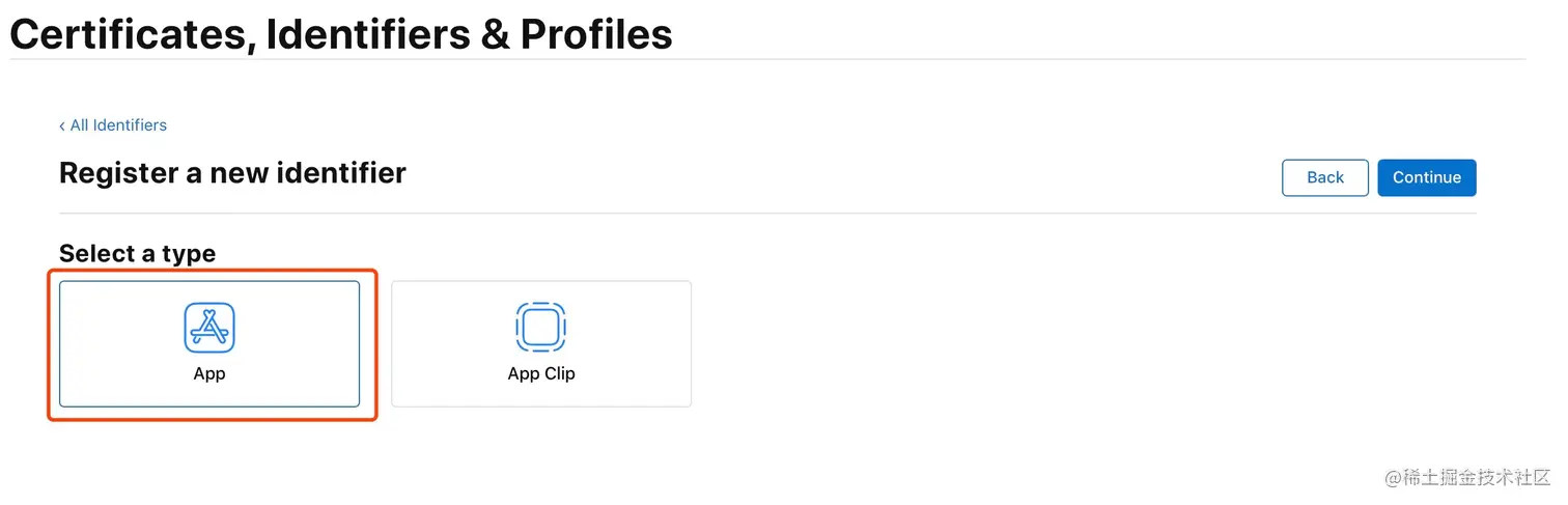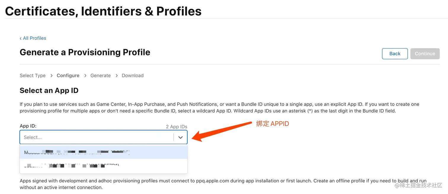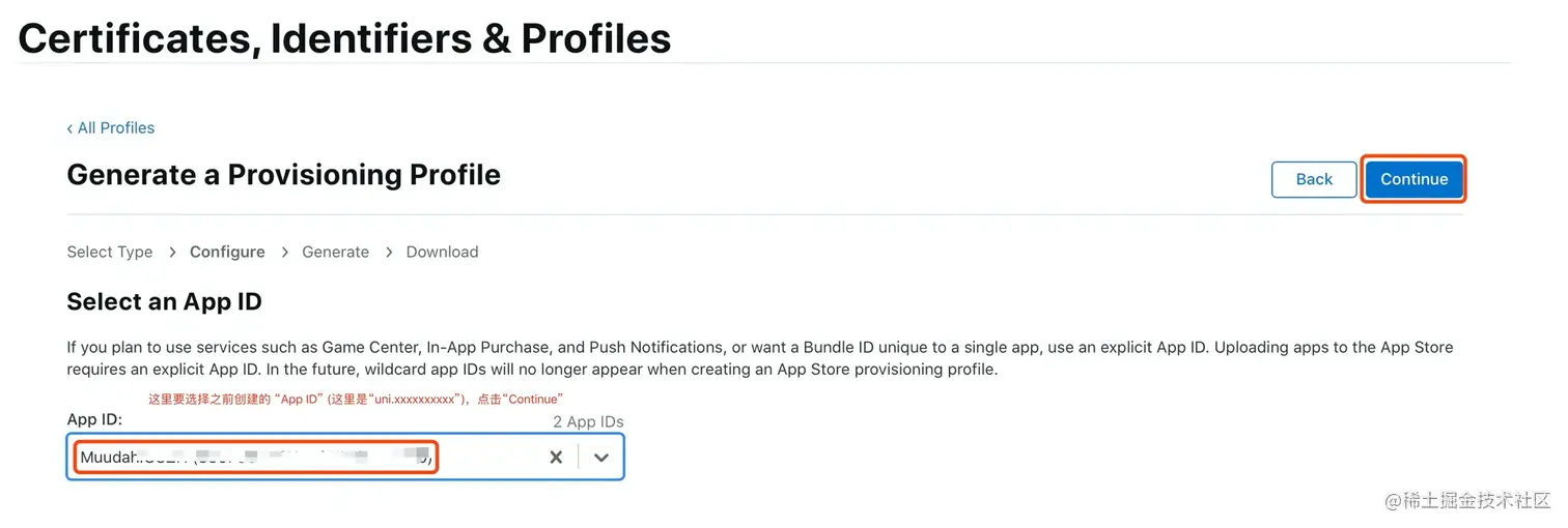 - 这里要选择之前创建的 “App ID” (这里是“uni.xxxxxxxxx”),点击“Continue”: