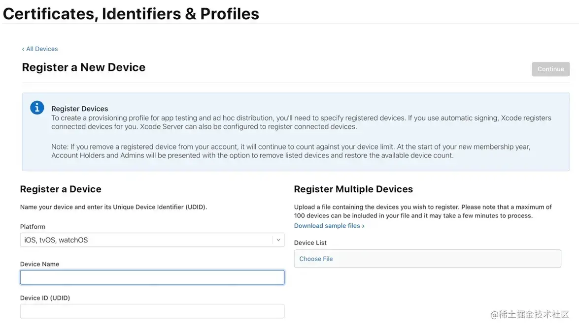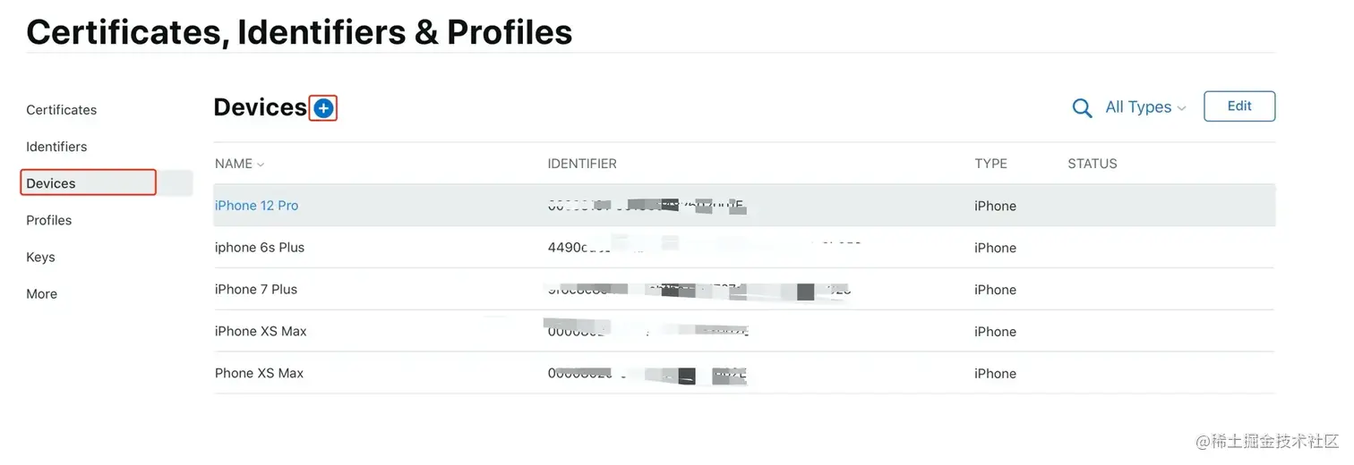 - 在证书管理页面选择 “Devices”,可查看到已添加的所有设备信息,点击页面上的加号来添加一个新设备: