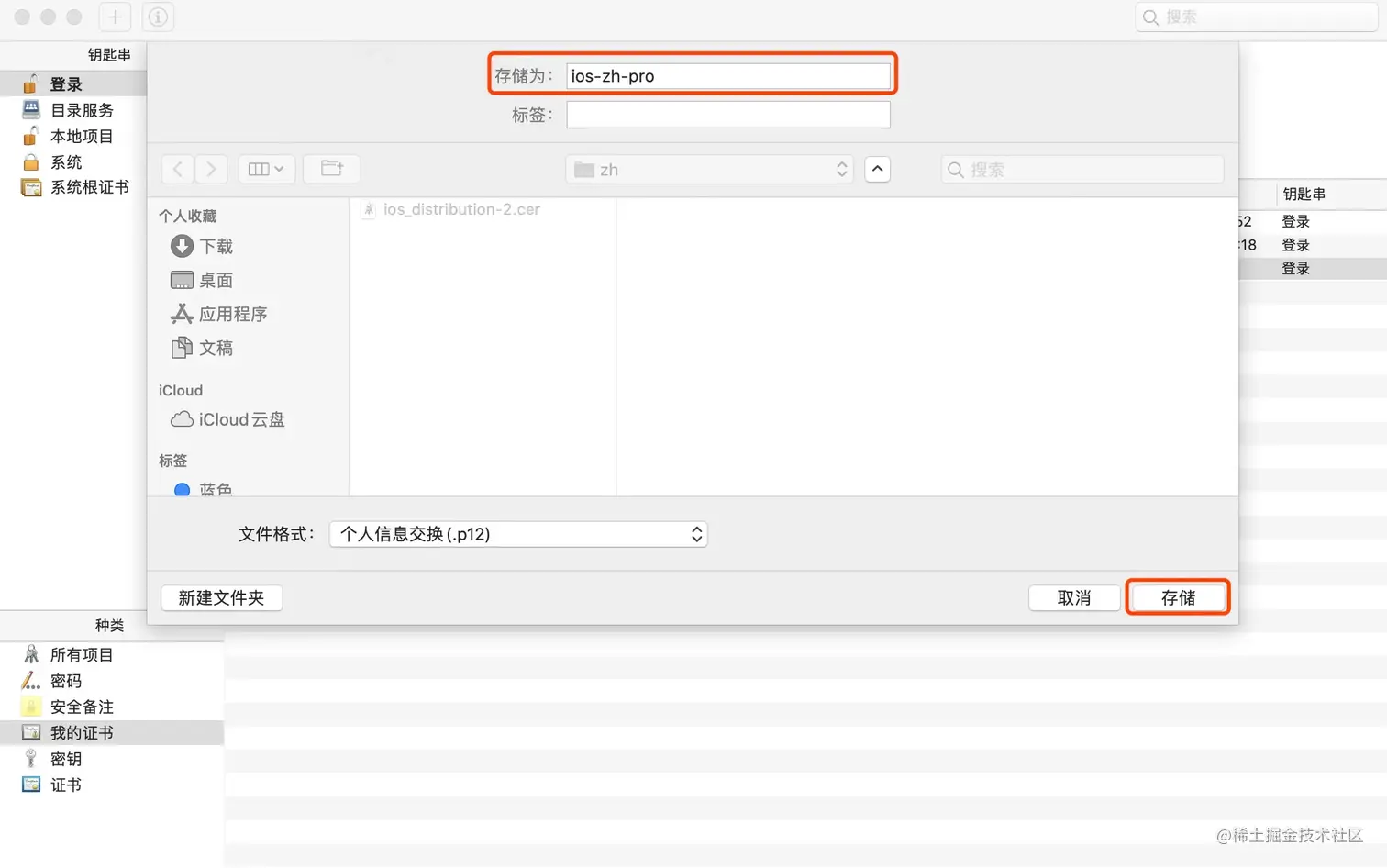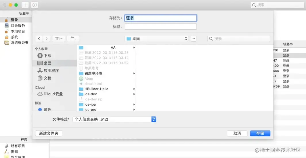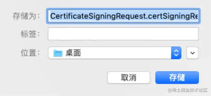 - 文件名称为 “CertificateSigningRequest.certSigningRequest”,选择保存位置,点击 “存储” 将证书请求文件保存到指定路径下,后面申请 开发(Development)证书 和 发布(Production)证书 时需要用到。