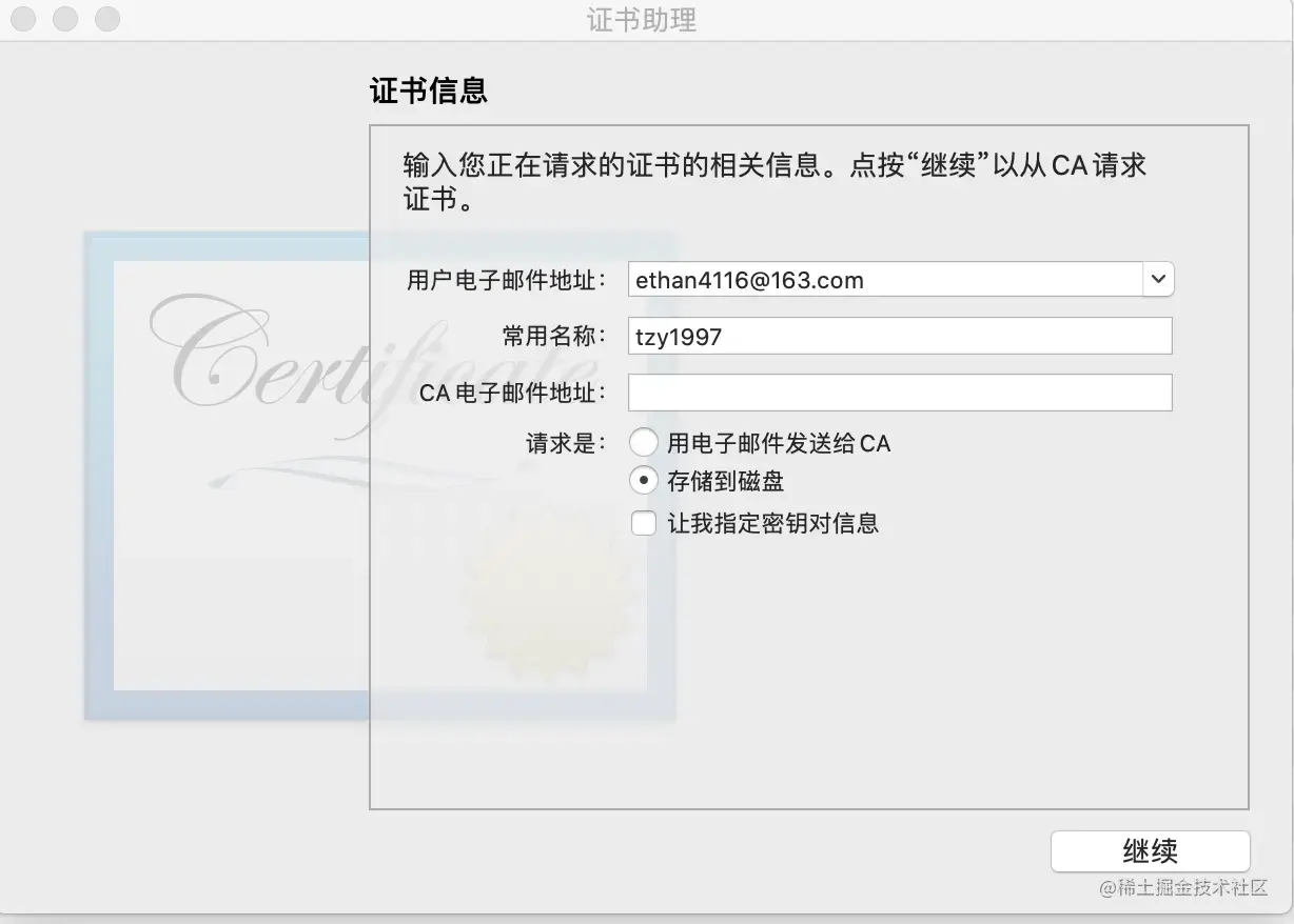 - 打开创建请求证书页面,在页面中输入用户邮件地址、常用名称,选择存储到磁盘,点击 “继续” :
