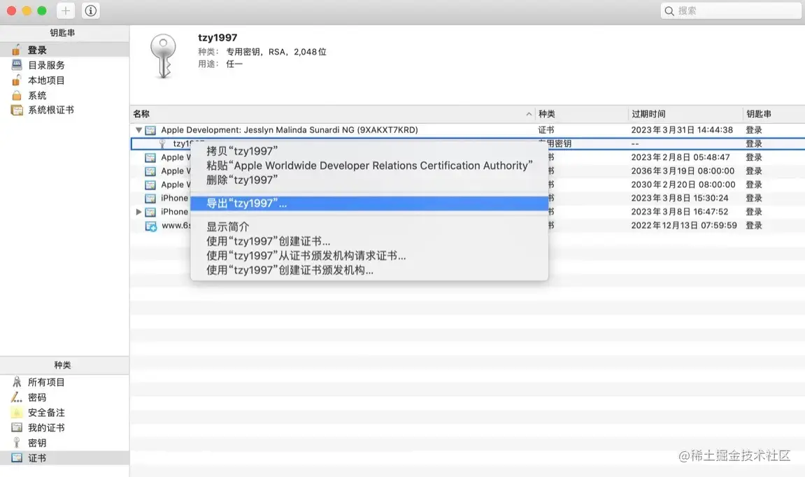 - 双击保存到本地的 development.cer 文件,会自动打开 “钥匙串访问” 工具说明导入证书成功,可以在证书列表中看到刚刚导入的证书,接下来需要导出 .p12 证书文件,选中导入的证书,右键选择 “导出xxxxxx”: