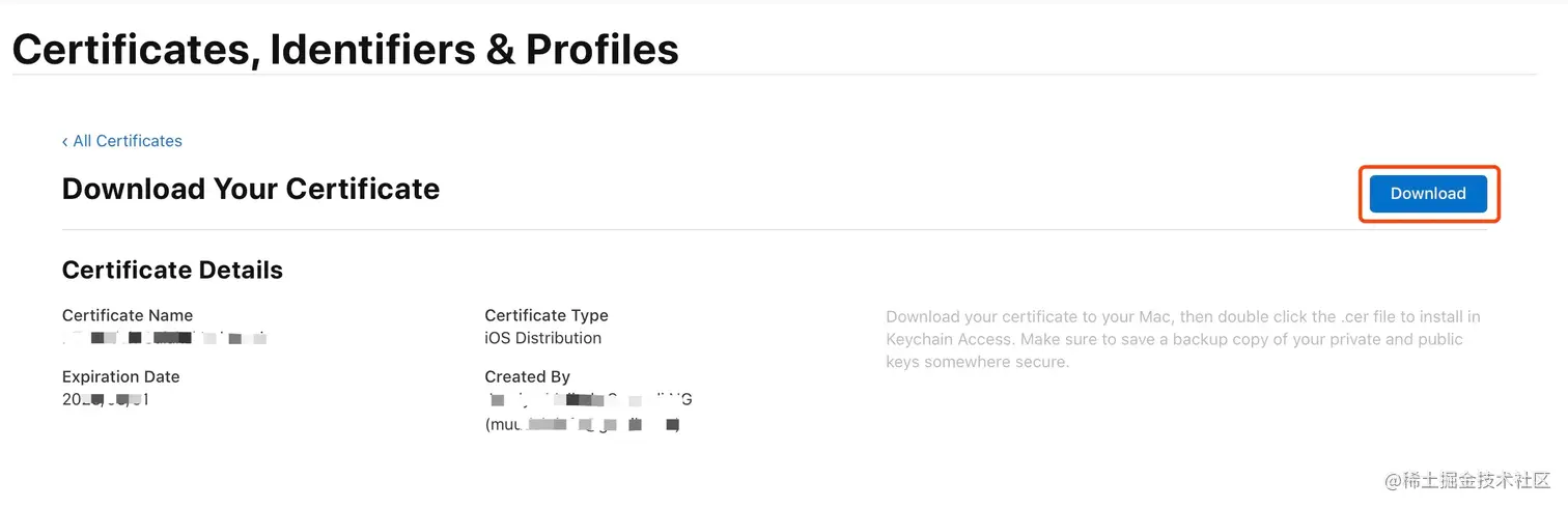 - 生成证书成功,选择“Download” 将证书下载到本地 (ios_production.cer):