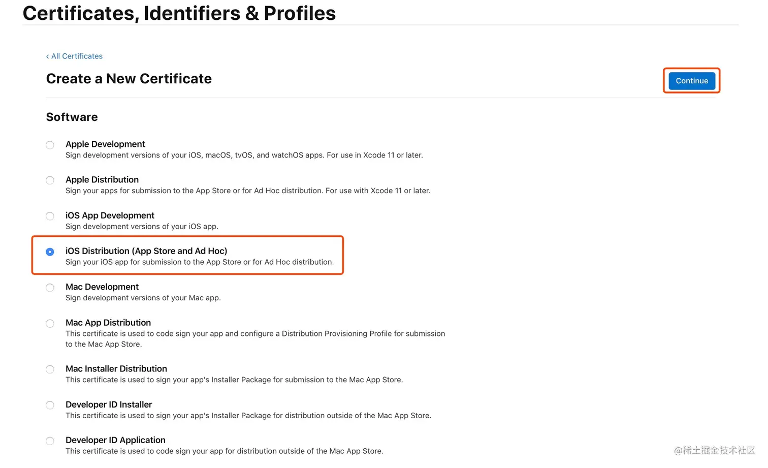 - 在 “Software” 栏下选中 “App Store and Ad Hoc”,点击 “Continue”:
