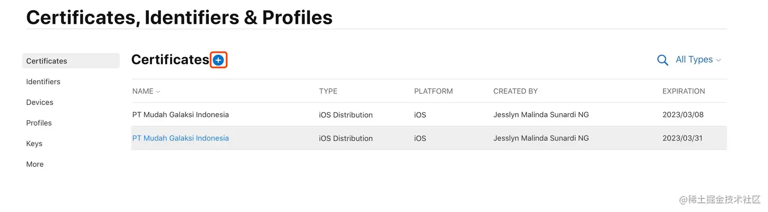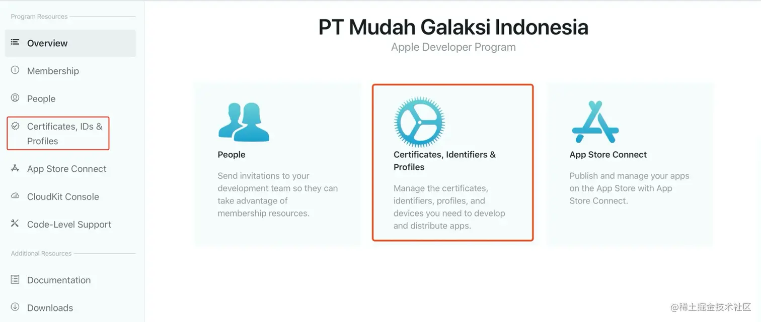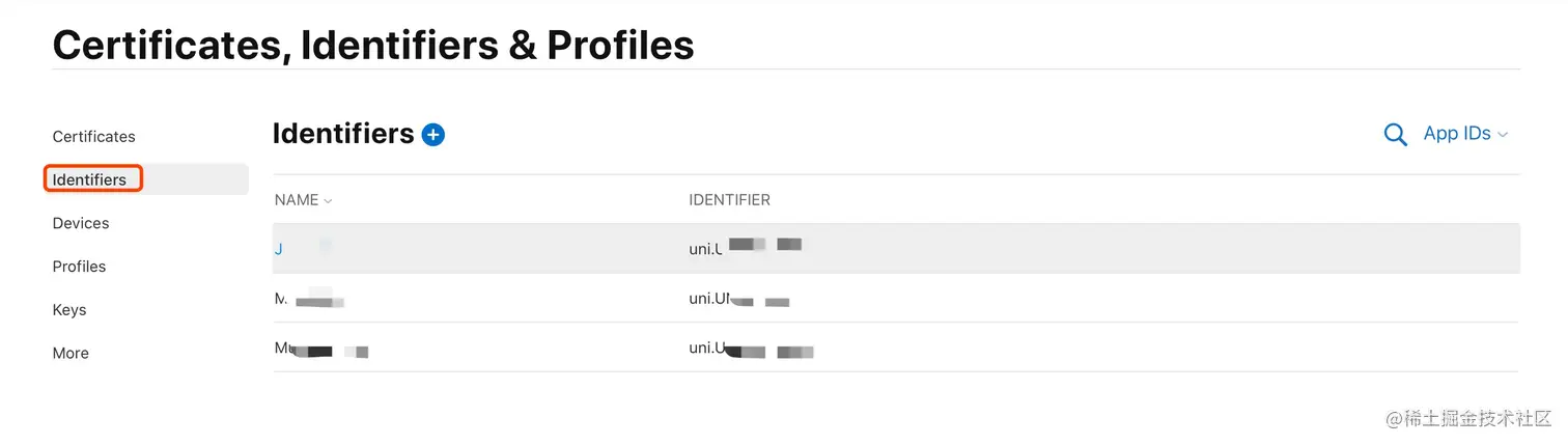 - 登录成功后在页面左侧选择 “Certificates,IDs & Profiles” 进入证书管理页面: