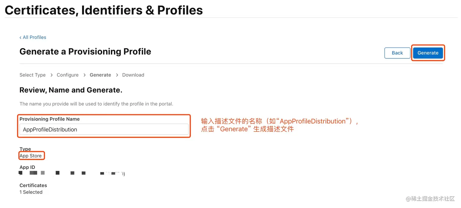 - 接下来输入描述文件的名称(如“AppProfileDistribution”), 点击 “Generate” 生成描述文件: