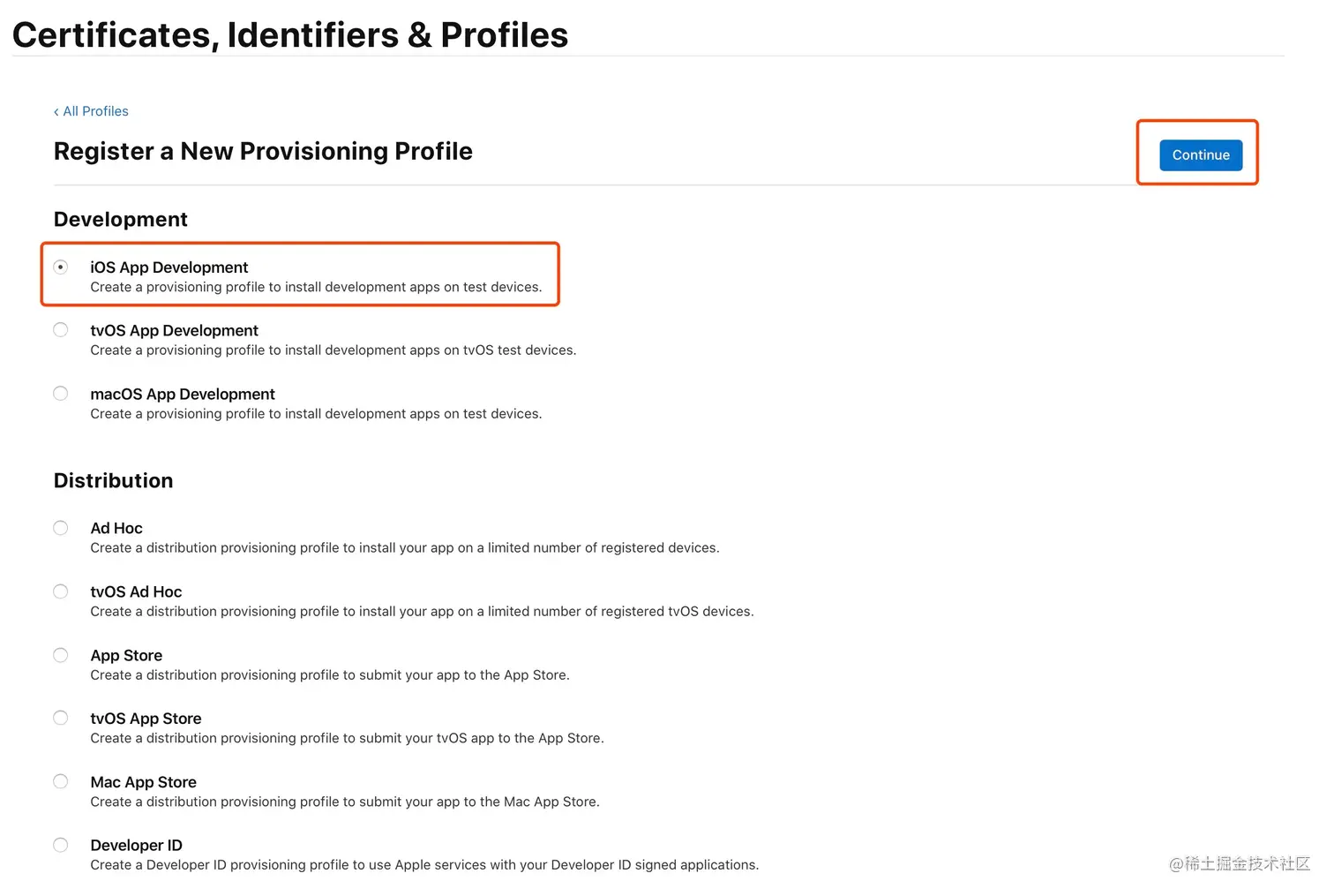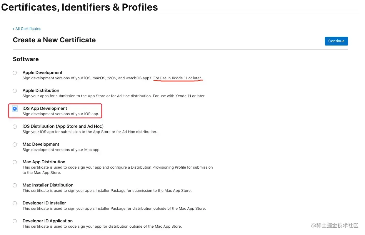 - 在 “Development” 栏下选中 “iOS App Development”,点击“Continue”按钮: