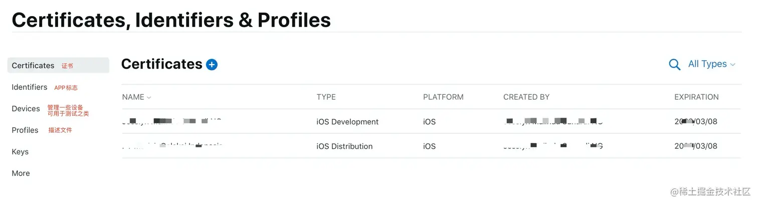 - 在证书管理页面,可以看到所有已经申请的证书及描述文件: