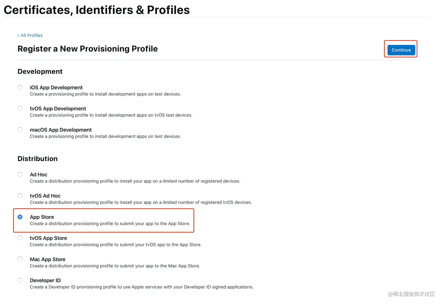 - 在 “Distribution” 栏下选中 “App Store”,点击“Continue”按钮: