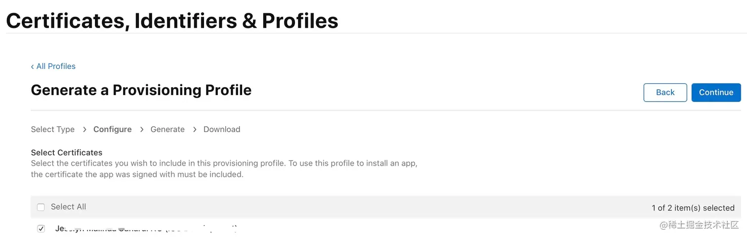 - 接下来选择需要绑定的发布证书(iOS Distribution),这里勾选刚刚生成的发布证书”,点击“Continue”: