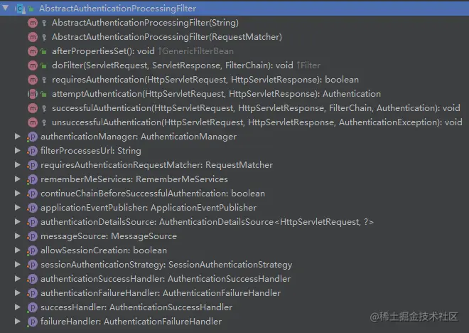 AbstractAuthenticationProcessingFilter抽象类的方法和属性如图所示。
