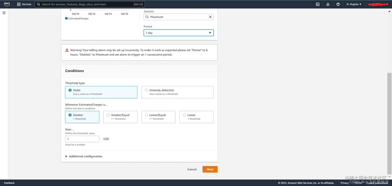 4.我们也可以用cloudwatch服务来设置花费预警,当然cloudwatch的功能不仅能设置花费,还可以看服务的日志,组件的状态等,是一个全方位的控制台。