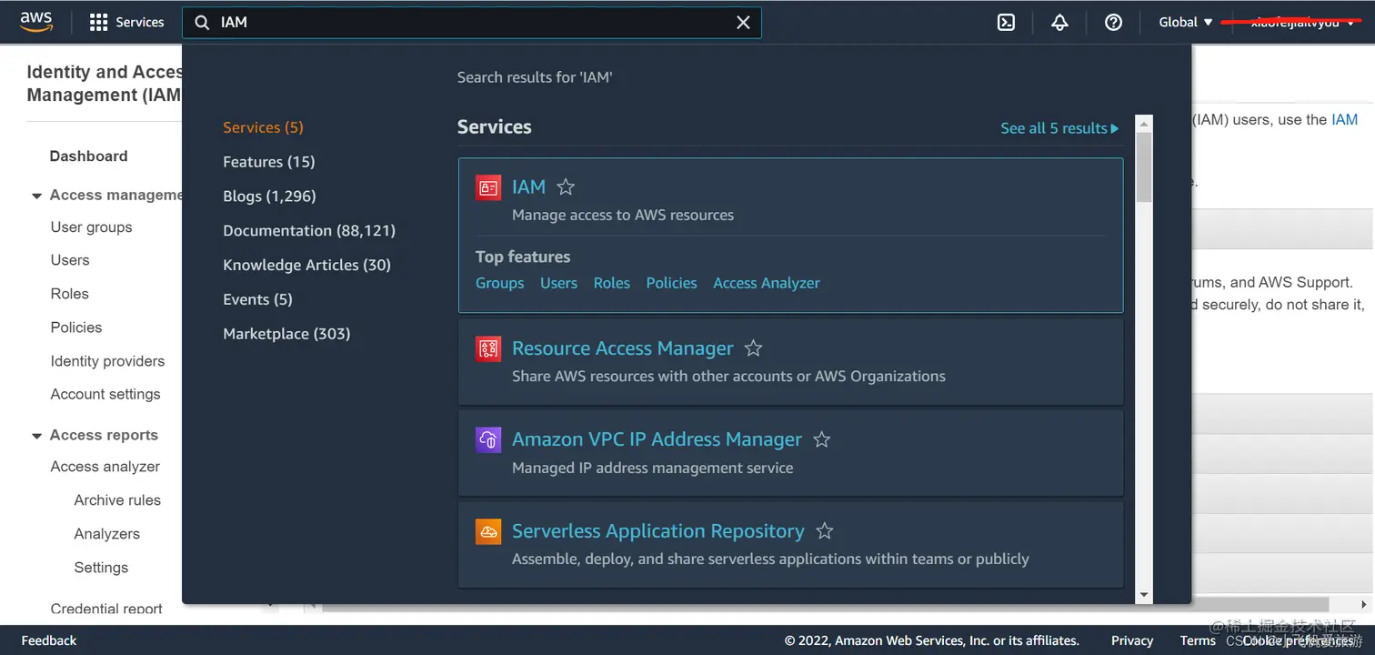 4.由于我们开发基本上都是一个团队协作完成,那么其他同事如何访问AWS上面资源呢,切记不要把自己的账号泄露,因此AWS提供了IAM Service 来添加IAMUser、权限和分组等。具体资源分配请参考官网文档。