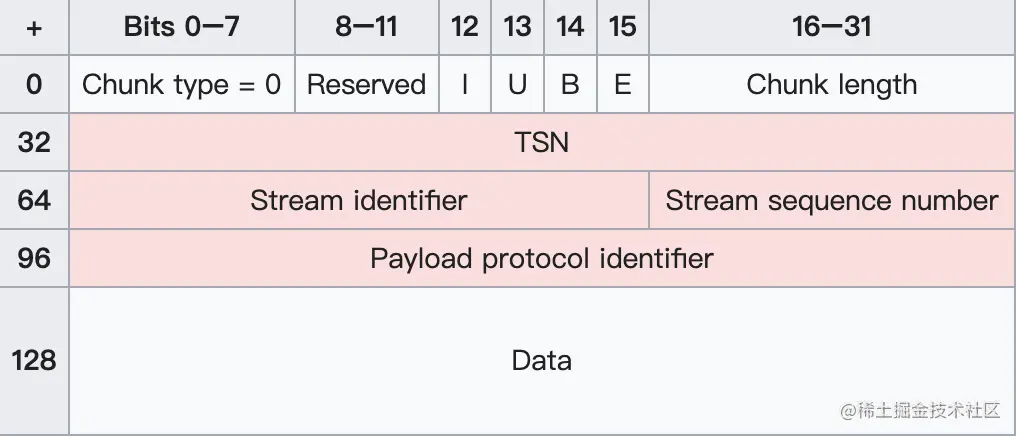 I — 表示应该立刻返回SACK chunk。 U - 如果设置,表示这个数据是无序的,那么后面的流序列号是无效的。 B - 如果设置,表示的是beginning fragment。 E - 如果设置,表示的是end fragment。