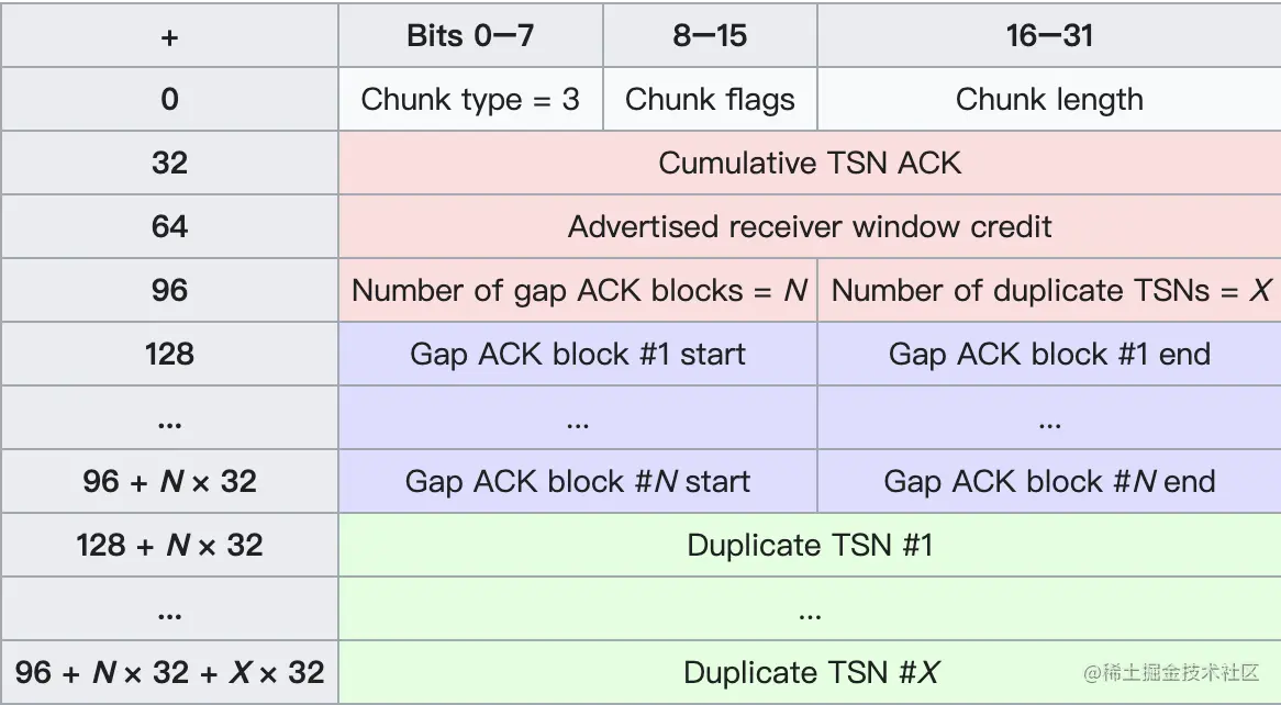 最后,SACK可能接收多个TSN,所以这里有个重复TSN的概念,这里叫做Duplicate TSN #X。