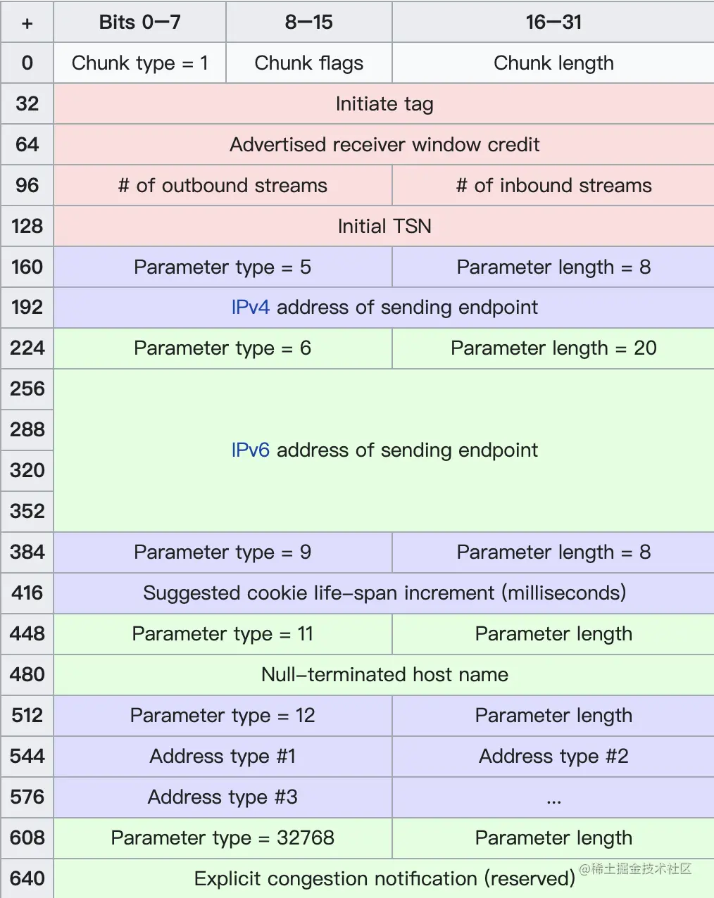 INIT chunk是初始化请求的chunk,它的chunk type=1,我来看下他的具体格式定义: