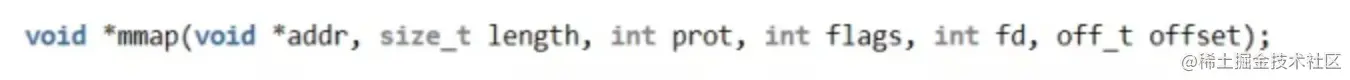 void *mmap(void *addr, size_t length, int prot, int flags, int fd, off_t offset); 1 addr:指定映射的虚拟内存地址 length:映射的长度 prot:映射内存的保护模式 flags:指定映射的类型 fd:进行映射的文件句柄 offset:文件偏移量