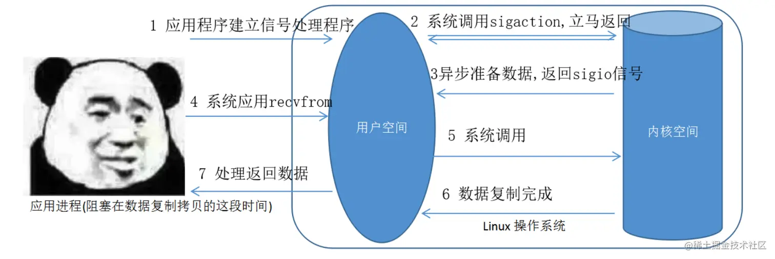 信号驱动IO,调用sigaltion系统调用,当内核中IO数据就绪时以SIGIO信号通知请求进程,请求进程再把数据从内核读入到用户空间,这一步是阻塞的。