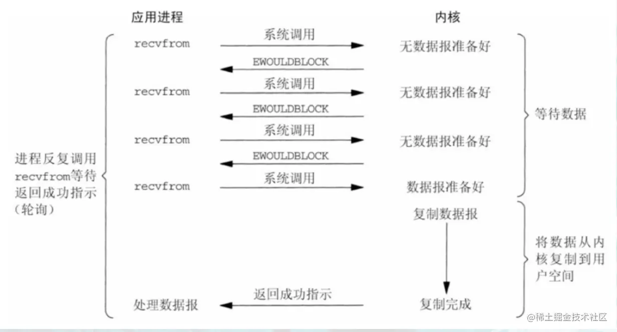 用户进程发起请求,如果数据没有准备好,那么立刻告知用户进程未准备好;此时用户进程可选择继续发起请求、或者先去做其他事情,稍后再回来继续发请求,直到被告知数据准备完毕,可以开始接收为止; 数据会由用户进程完成拷贝