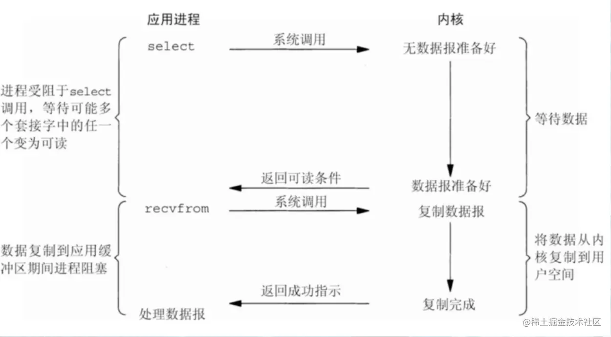- IO Multiplexing中select等函数为阻塞、拷贝数据时也阻塞(用户进程主动等待,并在拷贝时也等待)