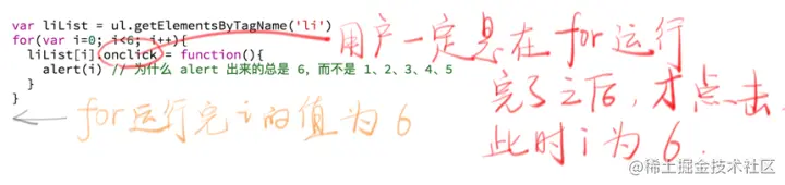 var liList = ul.getElementsByTagName('li') for(var i=0; i<6; i++){ liList[i].onclick = function(){ alert(i) // 为什么 alert 出来的总是 6,而不是 0、1、2、3、4、5 } }为什么 alert 的总是 6 呢,因为 i 是贯穿整个作用域的,而不是给每个 li 分配了一个 i,如下: