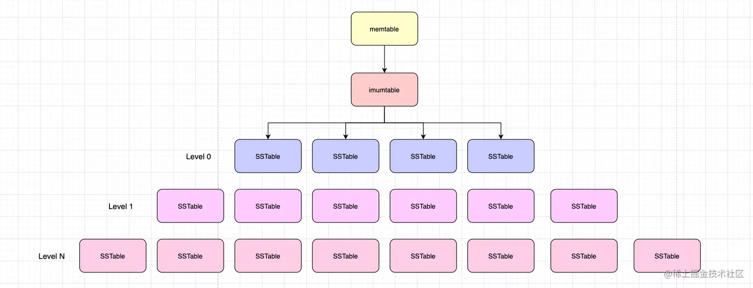 记录查询按照下面的层级关系进行搜索,首先是从当前内存中正在写入的memtable搜索,接着是imumemtable,再接着是存在于磁盘不同层级的SSTable,SSTable通过*.ldb的形式进行处理。