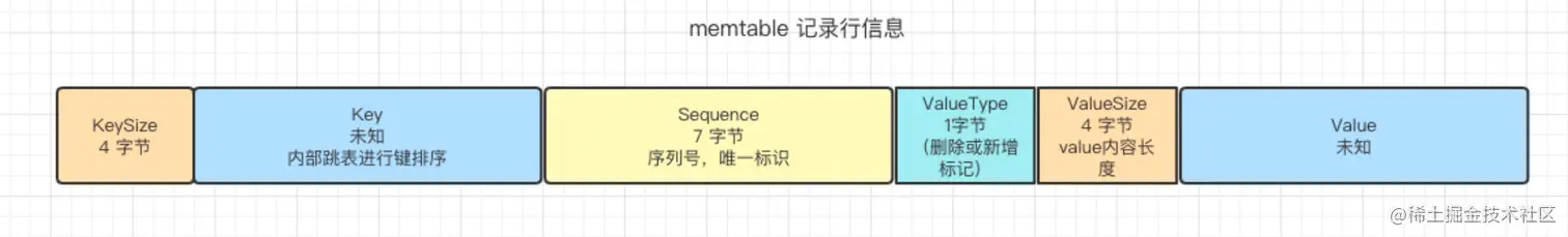 [[VarInt32编码]]:在这里虽然是变长整型类型但是实际使用4个字节表示。 uint64((sequence << 8) | type:运算之后实际为7个字节的sequence长度 注意在tag和value_size中间有一个ValueType标记来标记记录是新增还是删除。