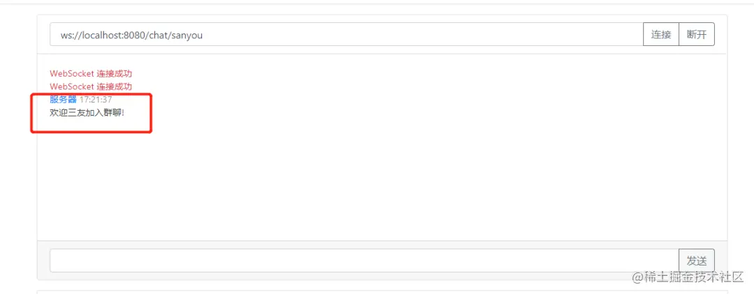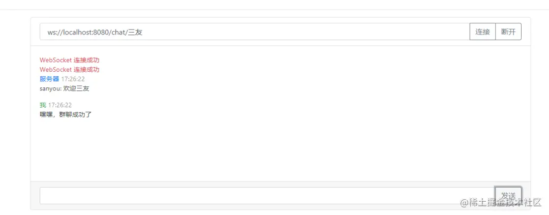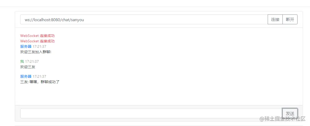 如果还想加入群聊,另外建立连接就行了,这样,一个简易的群聊功能就完成了。