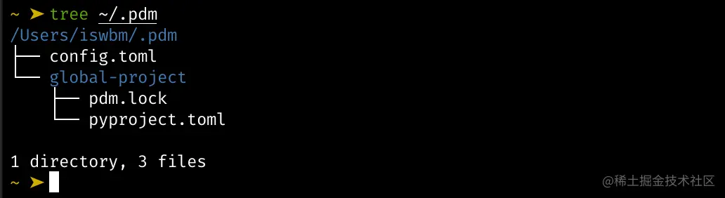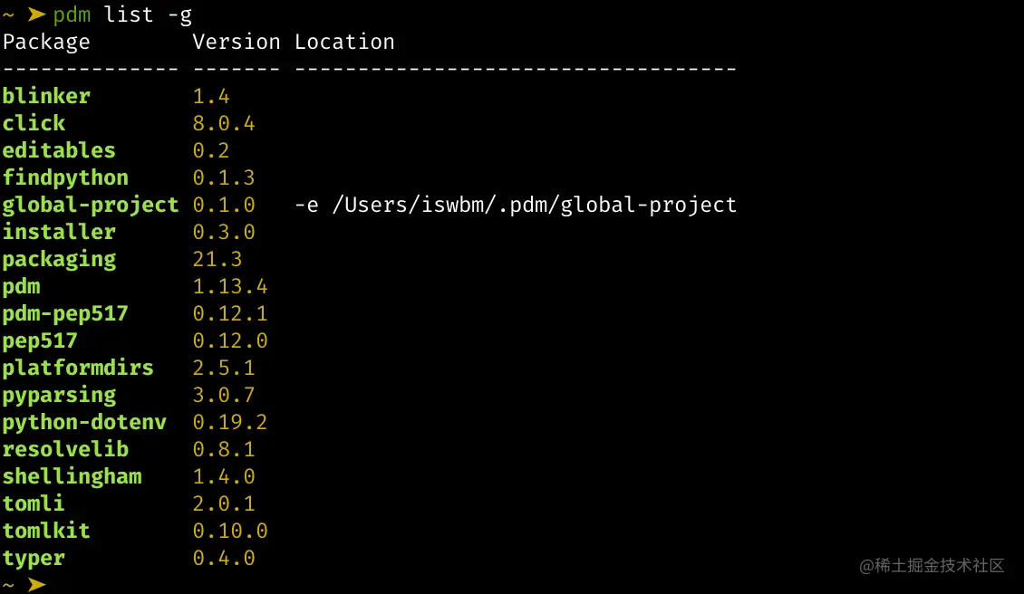 使用过 -g 后,你再使用 pdm list -g 查看全局已安装的包时,就会发现多了个 global-project 的包?然后在 Location 列有 -e /Users/iswbm/.pdm/global-project 指定全局模式 pyproject.toml 及 pdm.lock 所在的位置