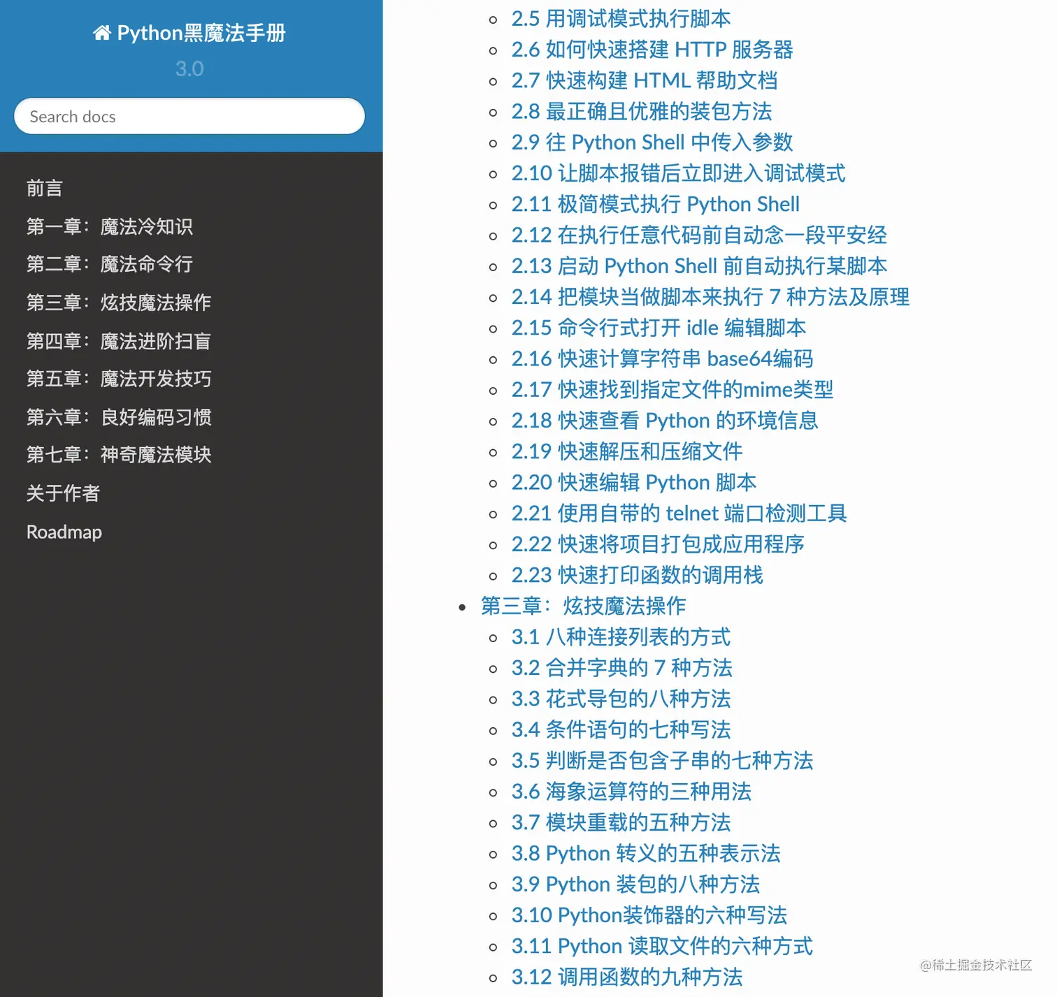 《Python黑魔法指南》目前迎来了 v3.0 的版本,囊集了 100 多个开发小技巧,非常适合在闲时进行碎片阅读。