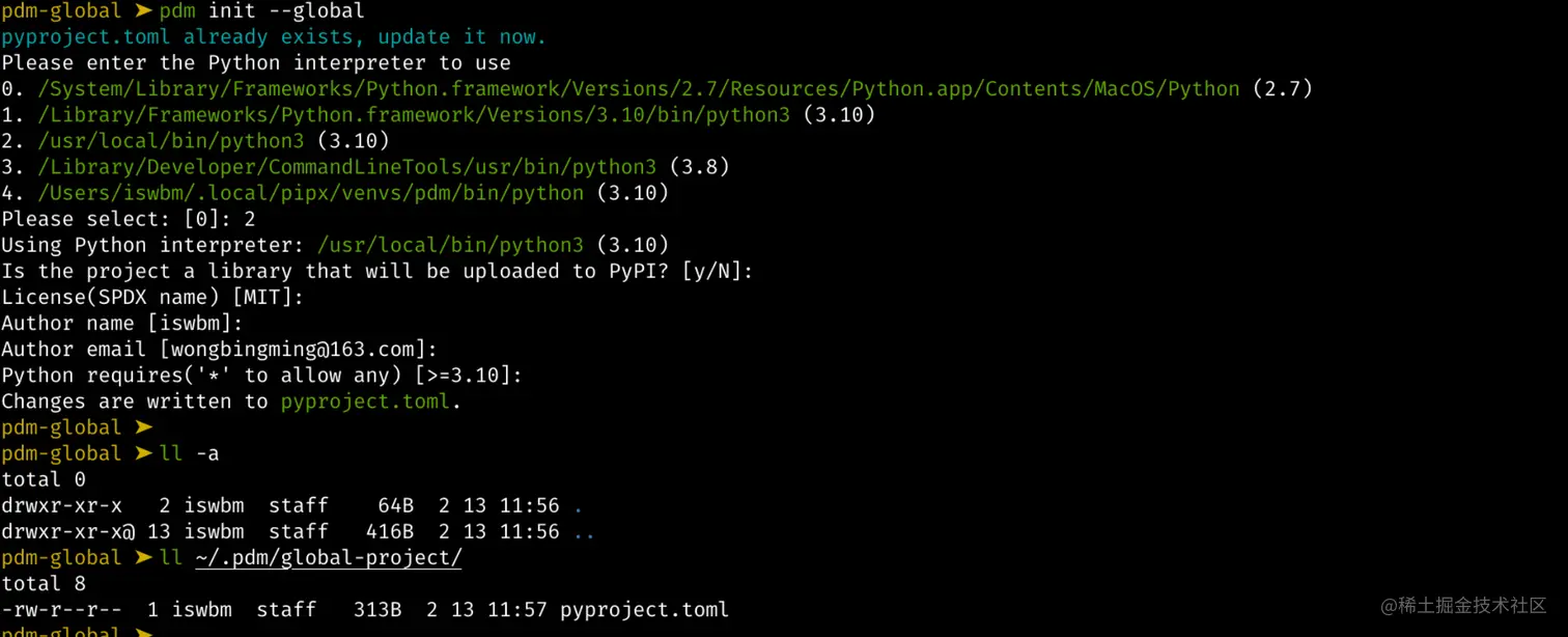 实际上,咱在初始化的时候,还可以再加个参数 -g/--global ,它表示该项目将使用全局的 pdm 的 pyproject.toml 配置文件。
