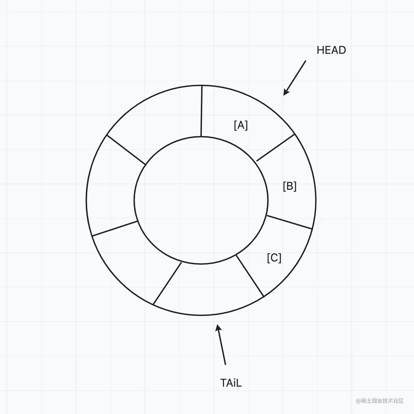 elements可以理解为该循环数组;head表示有效数据范围的头部,即可以进行移除操作数据对象的索引位;tail表示有效数据范围的尾部,即可以进行添加操作的数据对象的索引位;head属性和tail属性所标识的有效数据范围在不停的变化,有时候tail属性记录的索引位会小于head属性记录的索引位;